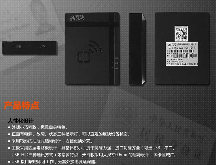 因納偉盛INVS300內置式身份證閱讀器外觀小巧精致,正面有電源,故障,狀態三種指示燈,體積小,抗干